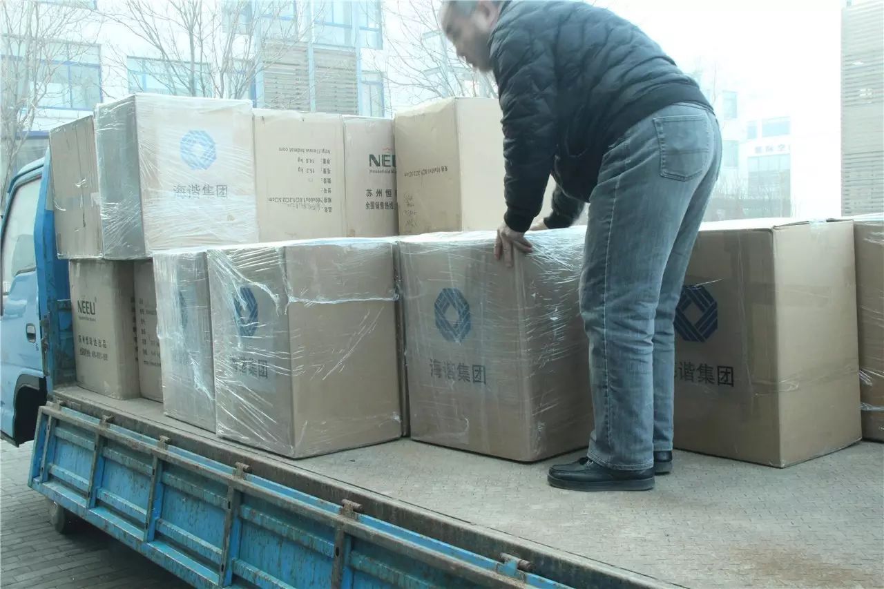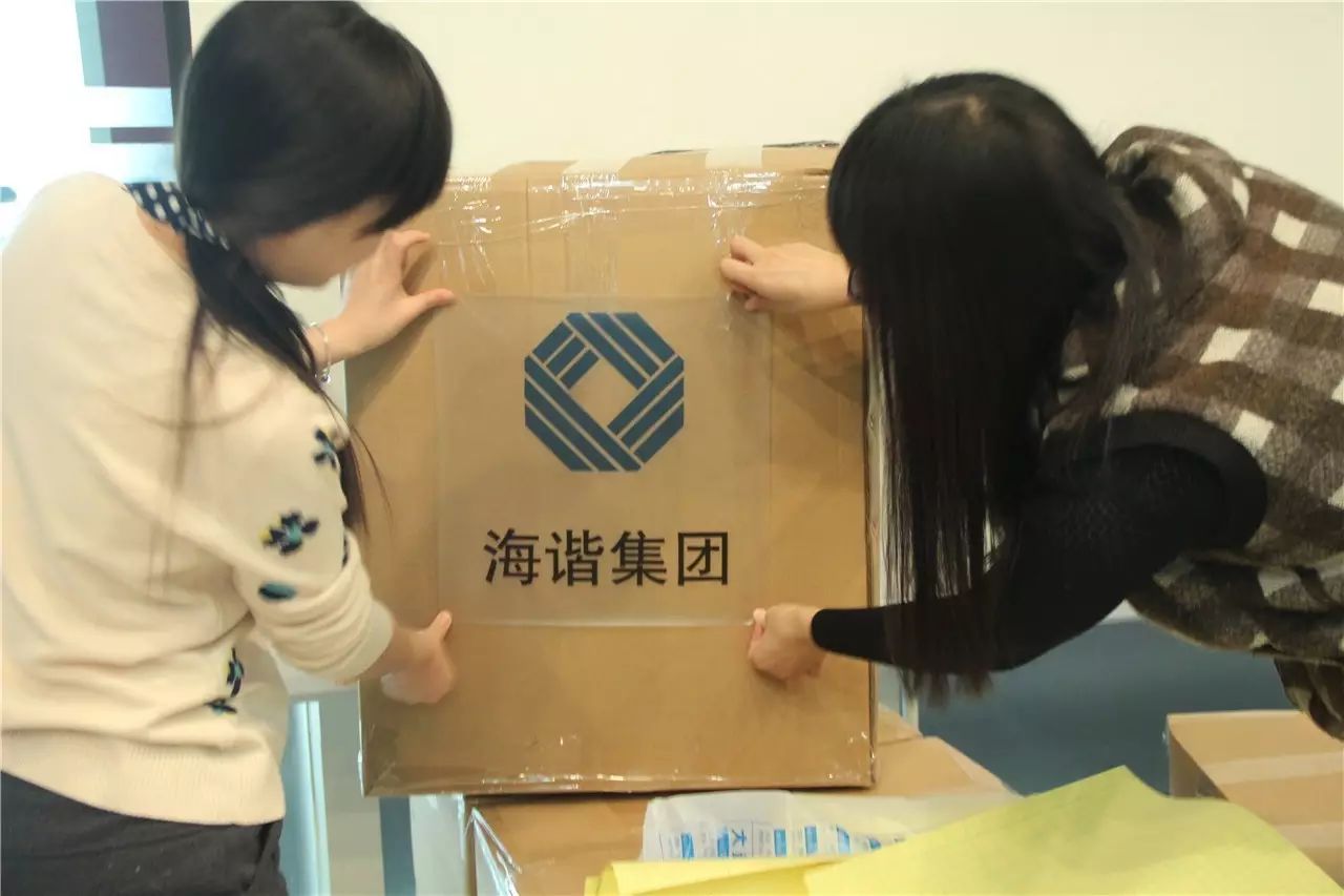 海谐集团员工将爱心物资打包装箱