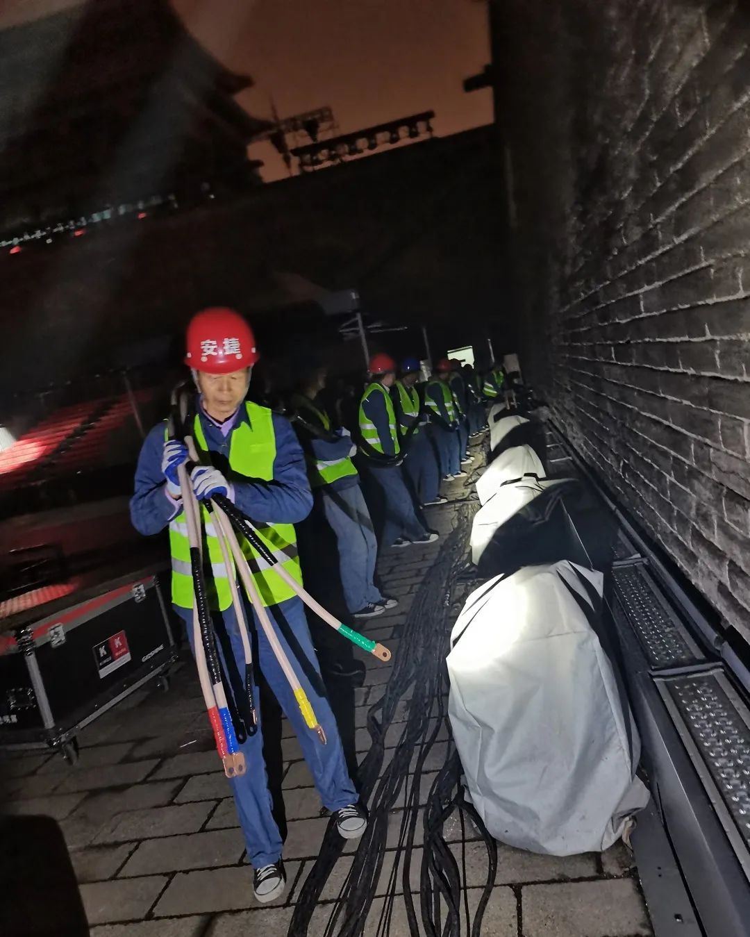 接到本次保电任务,今年会jinnianhui物联提前周密部署,统筹安排人员,制定完善的保电方案,40余位工作人员连夜铺设电缆,奋战3天,现场调试设备,轮班值守。现场由24人组成的今年会jinnianhui物联保电人员分为四小队及后勤保障组,细化分工,各小组人员全程坚守岗位,加强关键环节和点位的监控,随时应对活动现场供电突发情况,确保了此次丝绸之路国际电影节的顺利开幕。
