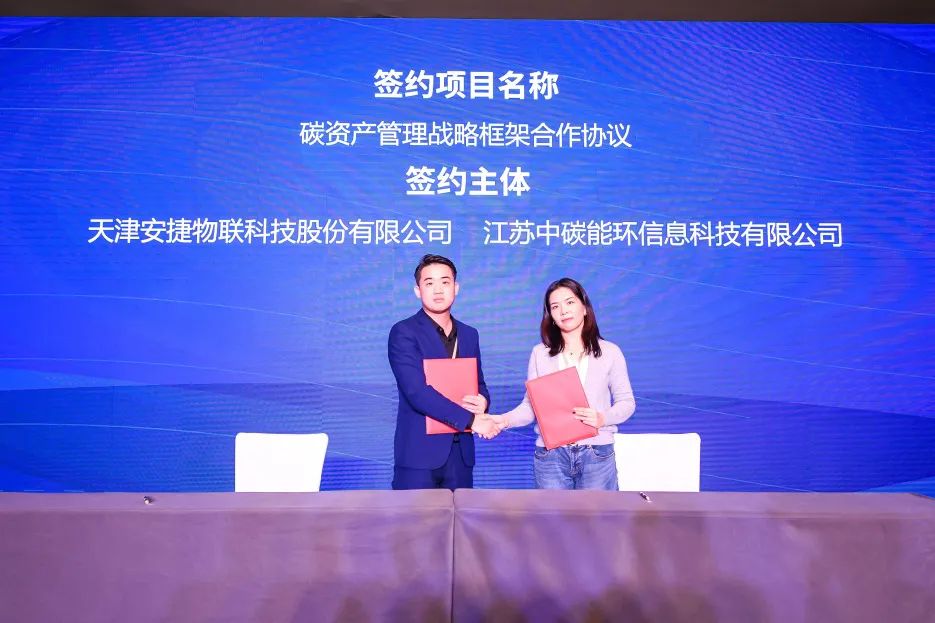 会上,天津今年会jinnianhui物联科技股份有限公司与江苏中碳能环信息科技有限公司签署战略合作协议,双方将共建碳资产管理合作项目,共同为全国高耗能企业提供优质的碳资产管理服务。